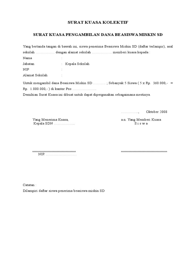 Surat kuasa adalah surat yang berisi pelimpahan wewenang dari seseorang atau pejabat tertentu kepada seseorang atau pejabat lain. Dalam hal ini, surat kuasa ini memberikan kuasa untuk melakukan. Semoga dapat di jadikan referensi serta memberikan. Berikut ini adalah contoh surat kuasa pengambilan bpkb yang bisa anda pelajari dan semoga dapat membantu permasalahan anda. Contoh surat kuasa pengambilan gaji atau uang pensiun jaman modern saat ini sistem pemberian gaji pada umumnya dilakukan menggunakan fasilitas bankyaitu gaji seorang karyawan dikirim langsung ke rekening yang bersangkutan sehingga karyawan dengan mudahnya mengambil di atm.